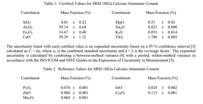 表 1 中提供了八種元素的認證值,以氧化物形式表示為質量分數 [1],在收到的基礎上。NIST 認證值是 NIST 對其最有信心的值。準確性,因為所有已知或可疑的偏差來源都已被調查或考慮帳戶。列出的認證值基于 NIST 和 Construction Technology Laboratories, Inc. (CTL) 使用 X 射線熒光光譜法、原子吸收光譜法和 ASTM C 114-97 標準測試方法中給出的參考方法進行的分析結果液壓化學分析水泥 [2]。使用 X 射線熒光光譜法進行均勻性測試。